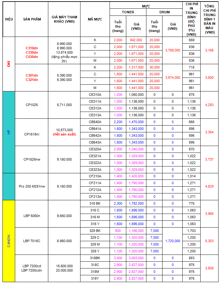 - Vậy các hãng khác họ đã thiết kế mực và Drum xài chung, khi mua 1 ống mực mới, khách hàng phải trả luôn tiền cho drum đc đính kèm ( gọi là cartridge) và nếu chúng ta làm một phép tính đơn giản cho giá mực chính hãng. (phí trên OKI đã tính cho bạn) Các bạn sẽ thấy với mỗi trang in , các bạn đã tiêu tốn ít nhất là 100 VNĐ nhiều nhất là 1000 VNĐ. (độ phủ 5%)